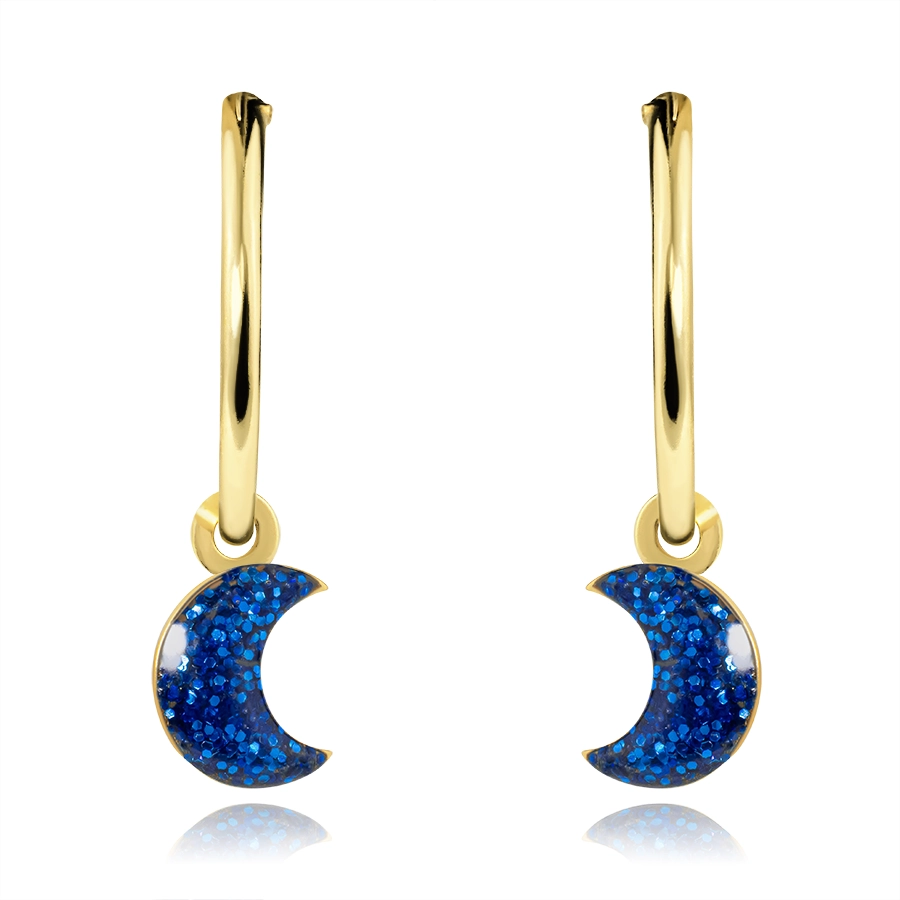 14K zlaté kulaté náušnice ve tvaru měsíce s modrými třpytkami
