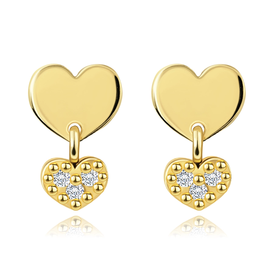 Náušnice ze 14K zlata se dvěma srdíčky a čirými diamanty