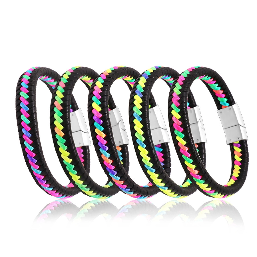Černý kožený náramek - zapletené různobarevné šňůrky, zásuvné zapínání